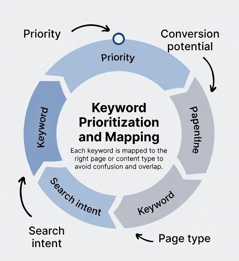 Each keyword is mapped to the right page or content type to avoid confusion and overlap.