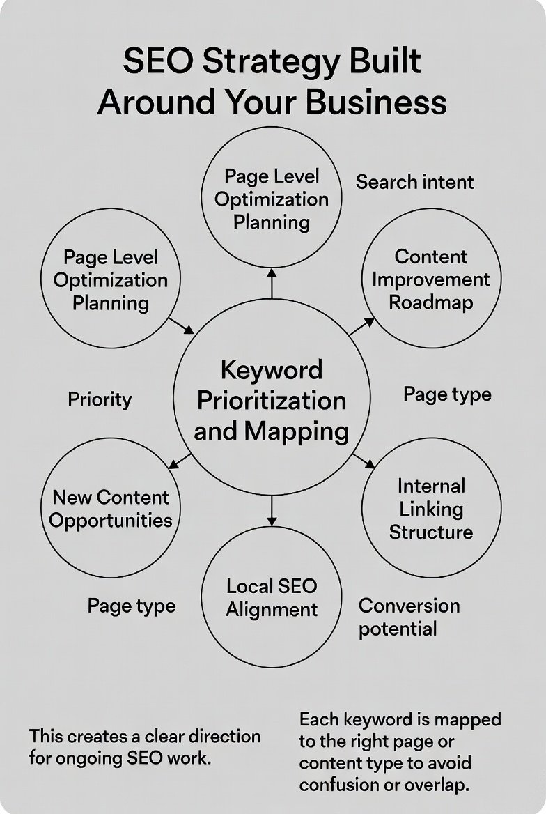 We organize keywords into a clear SEO strategy, mapping them to the right pages and defining priorities for content and optimization.